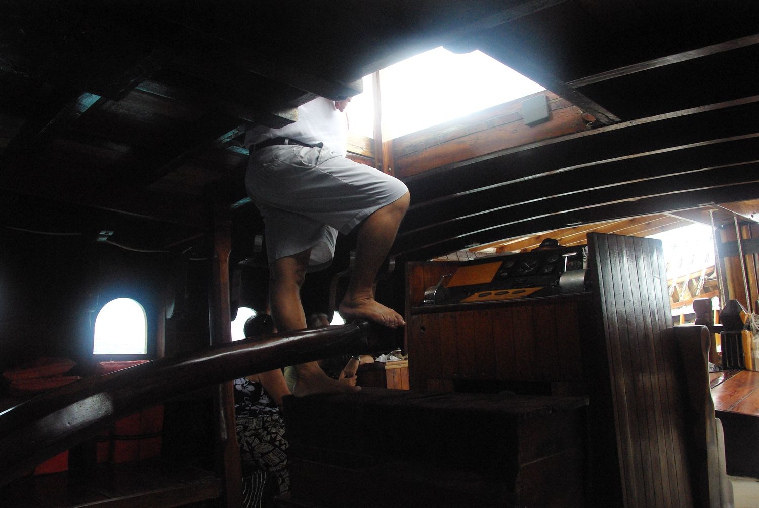 Steuerstand. Der Käpten steuert die Karavelle mit den Füßen.