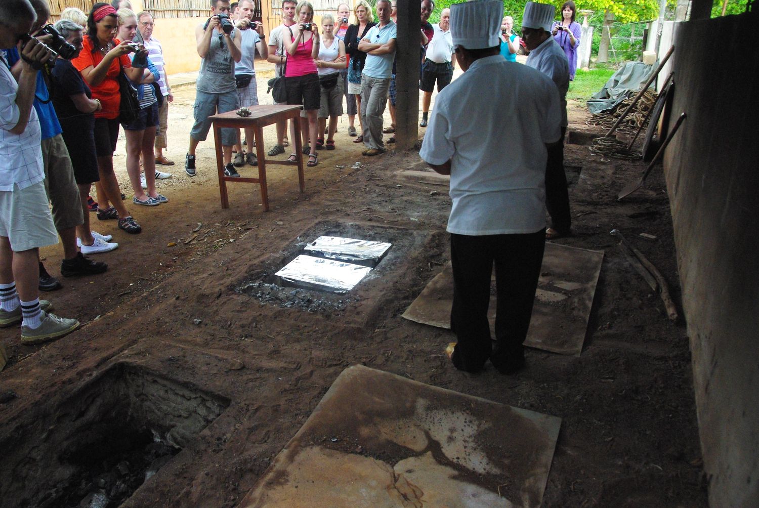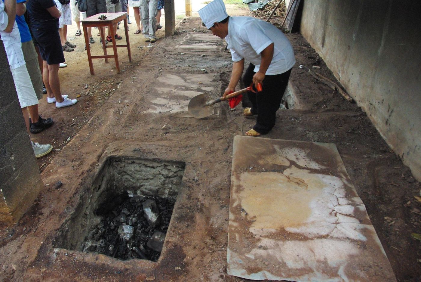 Der Koch gräbt das Mittagessen aus.