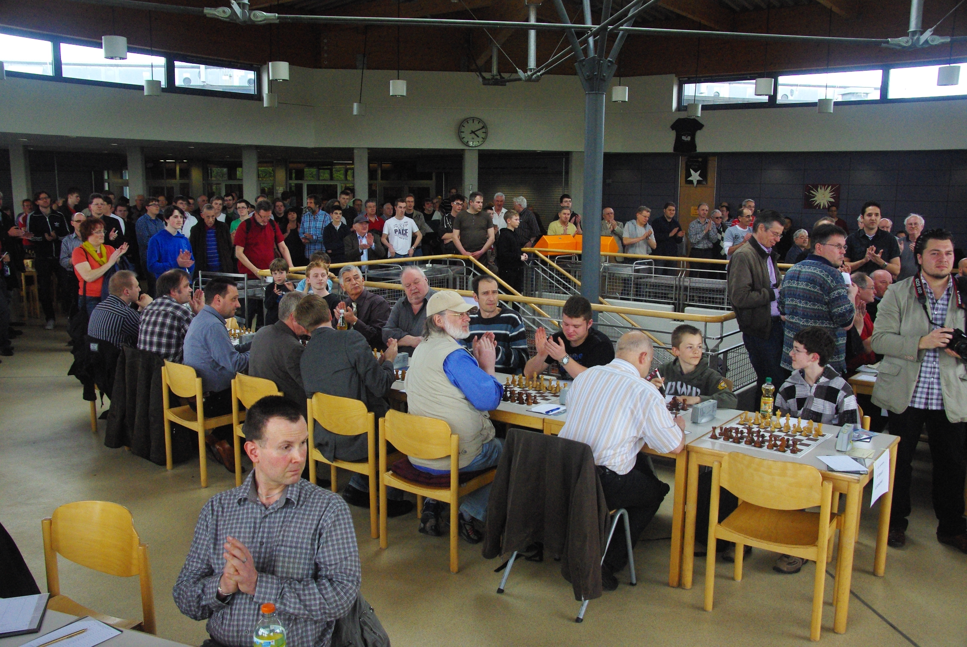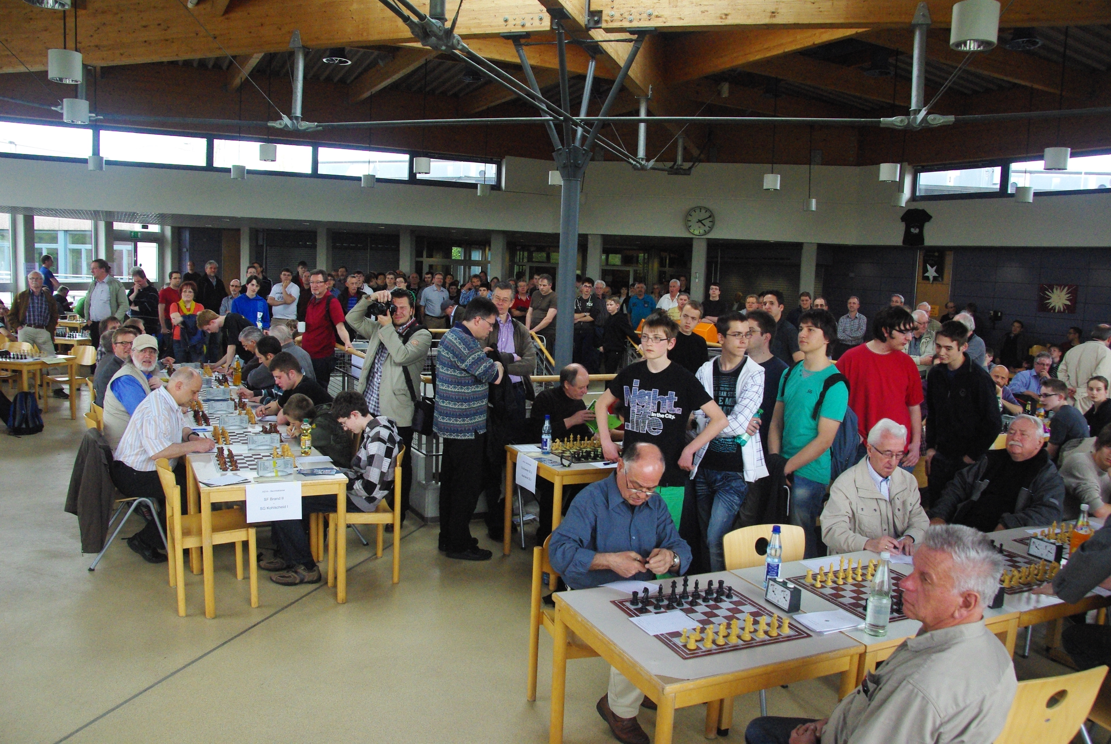 Die Schachfreunde des Aachener Schachverbands in der Mensa der Gesamtschule Brand, während der kurzen Ansprache des Präsidenten SB NRW, Ralf Niederhäuser